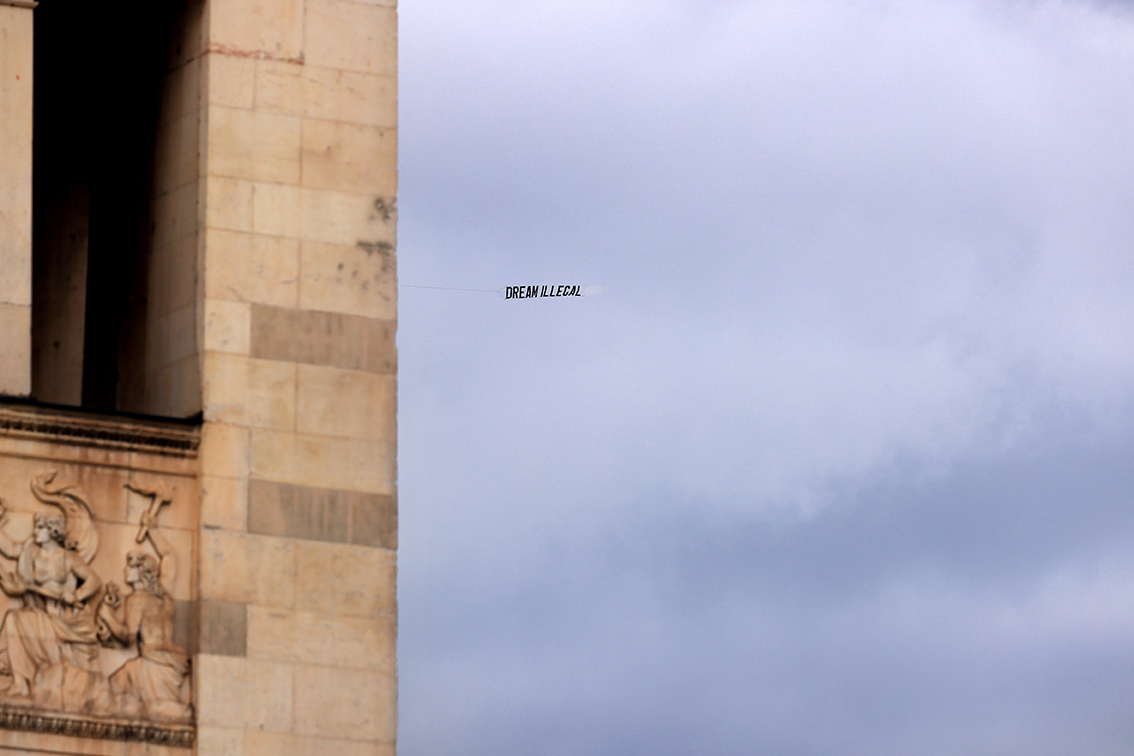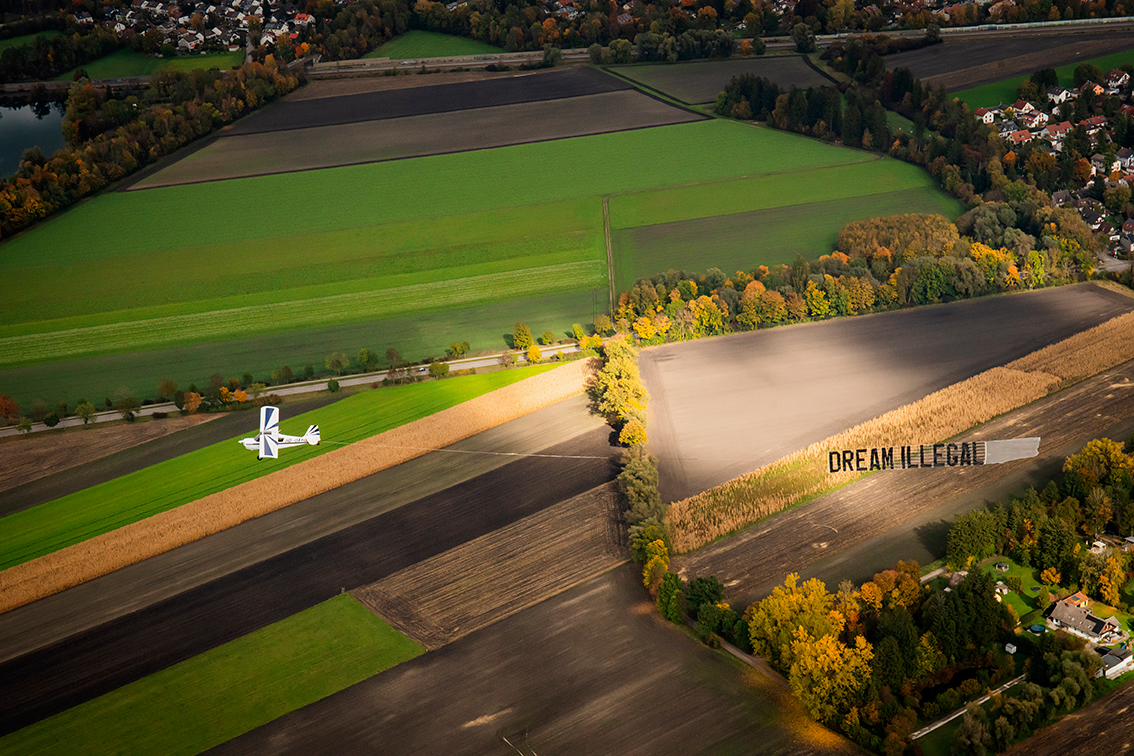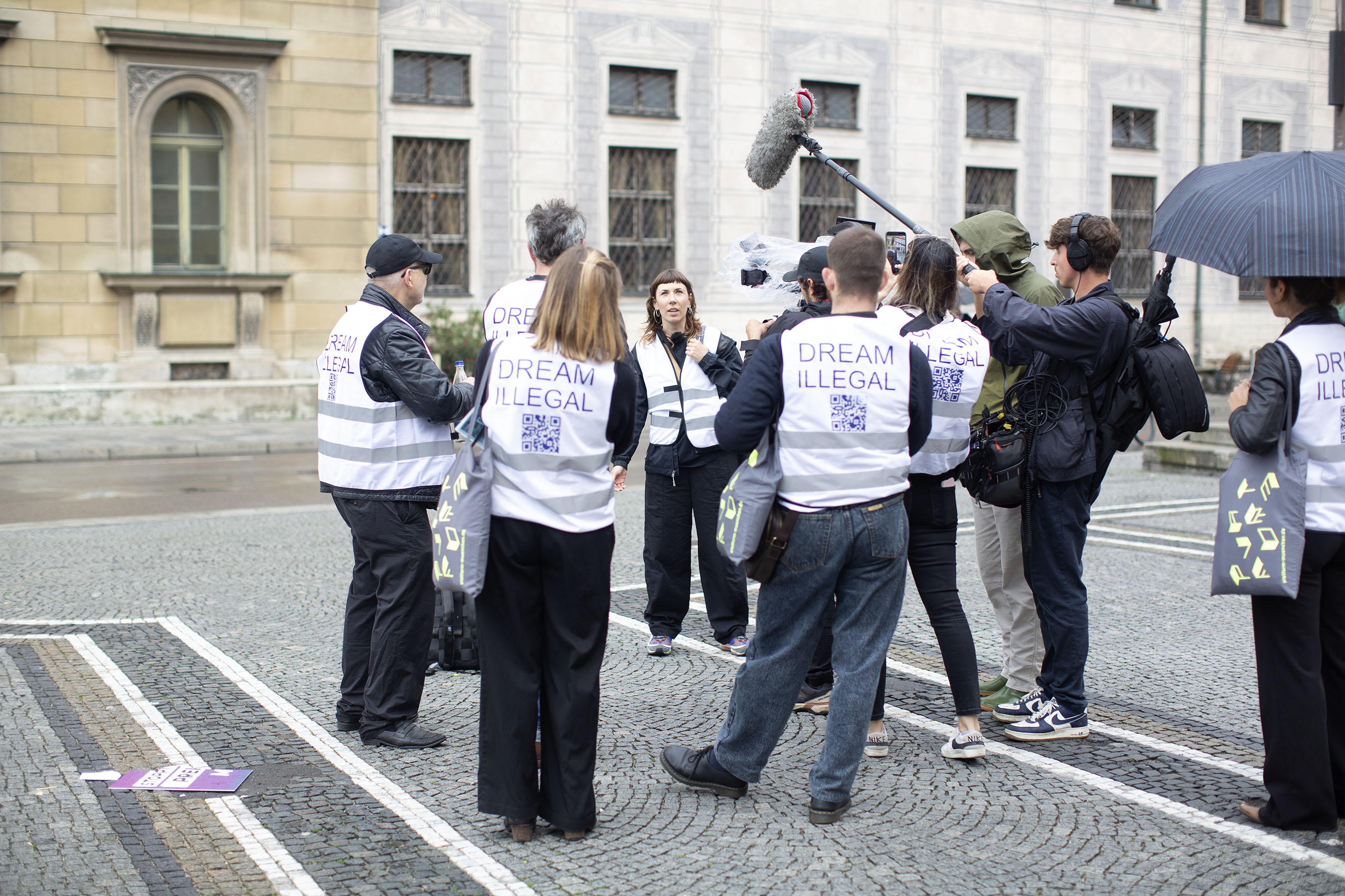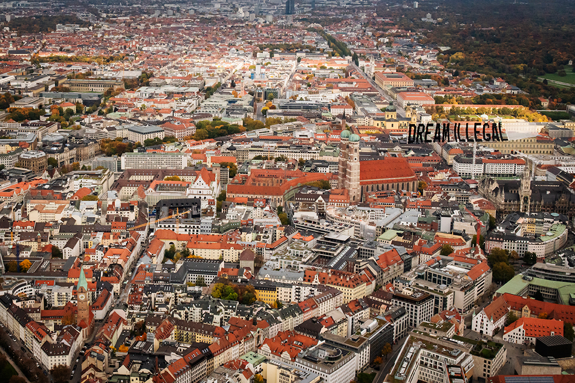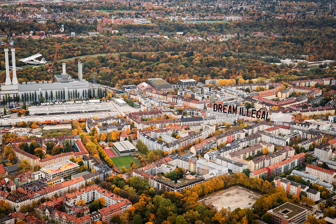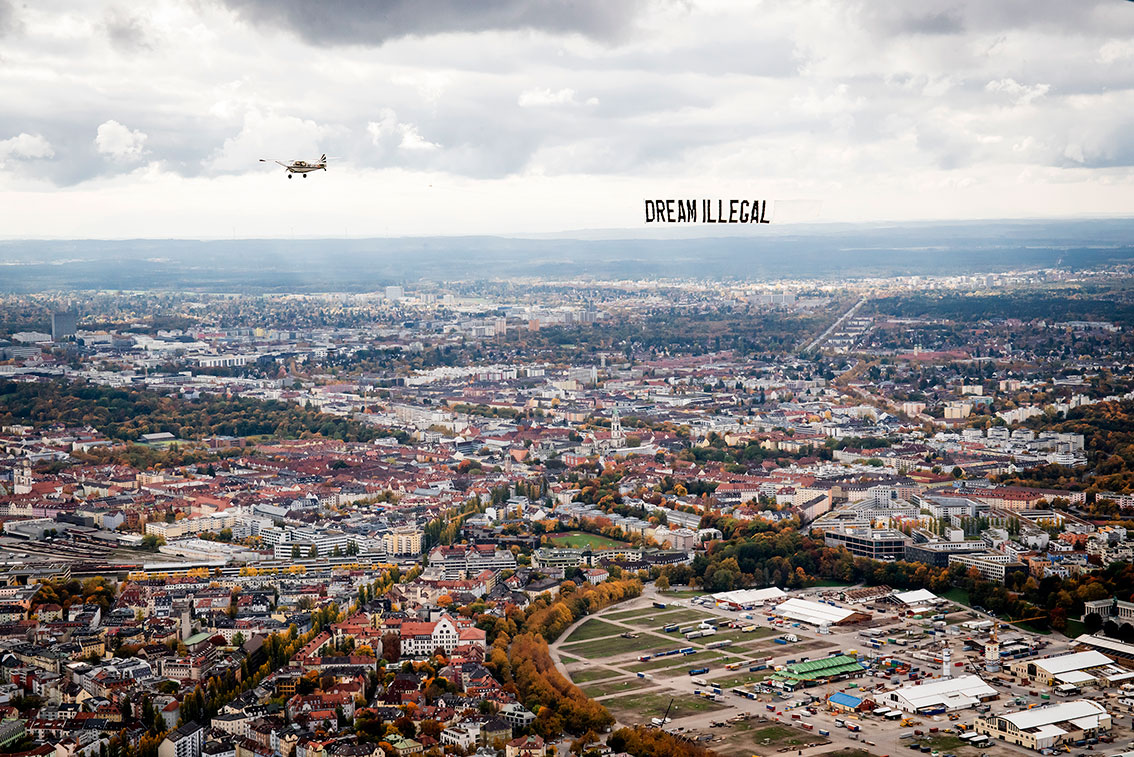 To this end, on 18 October 2025, between 12 noon and 2 p.m., a banner flight with the words 'DREAM ILLEGAL' could be seen above Munich city centre. This is an artistic intervention by the Arcadian Ambassador H.E. Peter Kees, the EMBASSY OF ARCADIA, in cooperation with PLATFORM Munich.