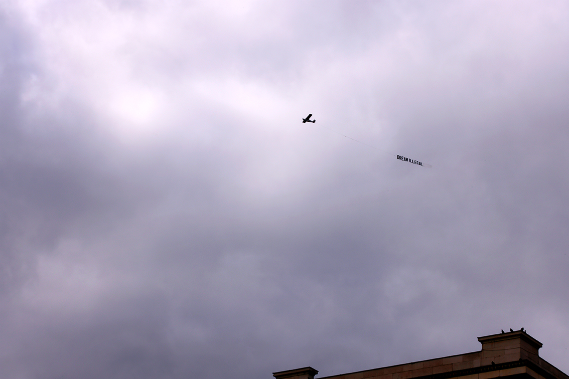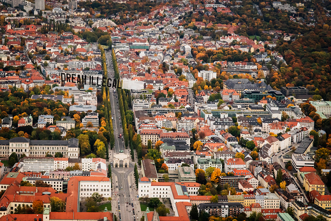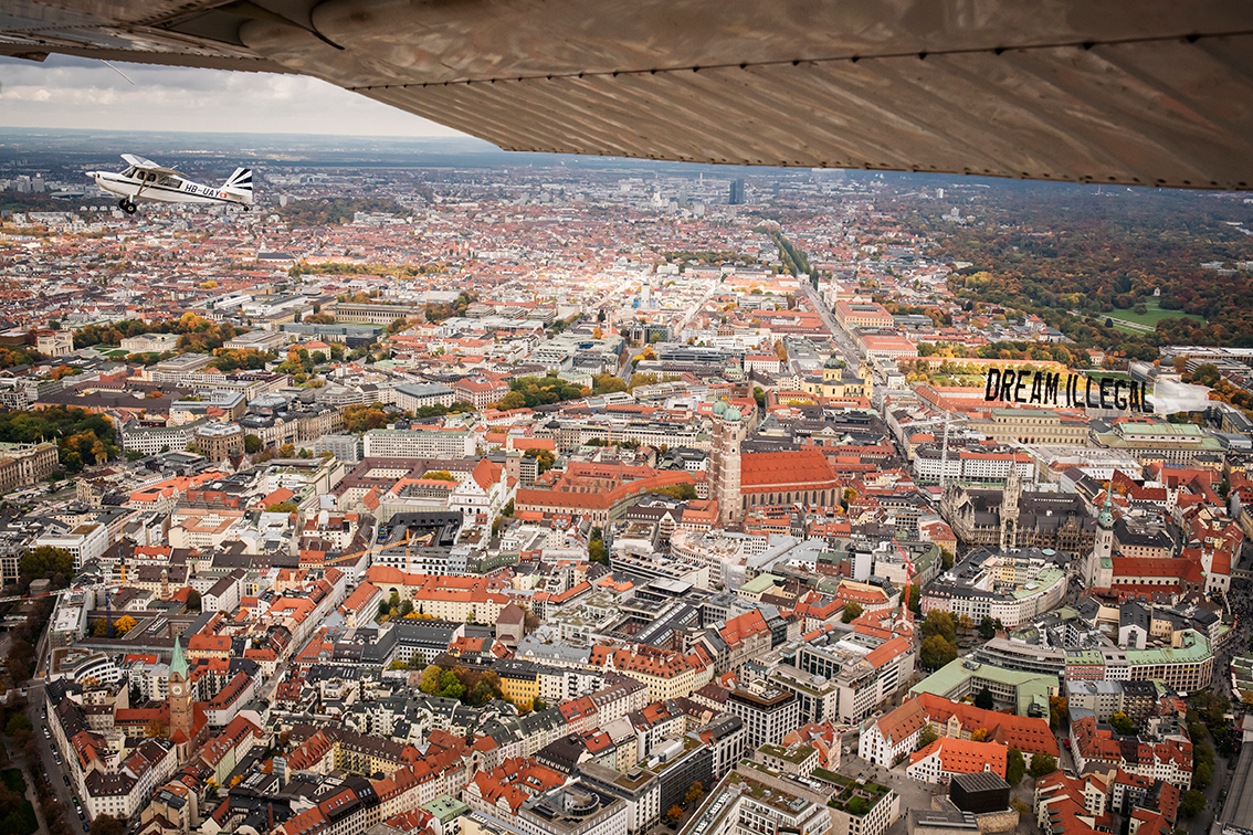 Dazu war am 18. Oktober 2025, in der Zeit von 12-14 Uhr, ein Bannerflug mit dem Schriftzug „DREAM ILLEGAL“ über der Innenstadt von München zu sehen. Dabei handelt es sich um eine künstlerische Intervention des Arkadischen Botschafters S.E. Peter Kees, der EMBASSY OF ARCADIA, in Kooperation mit der PLATFORM München.