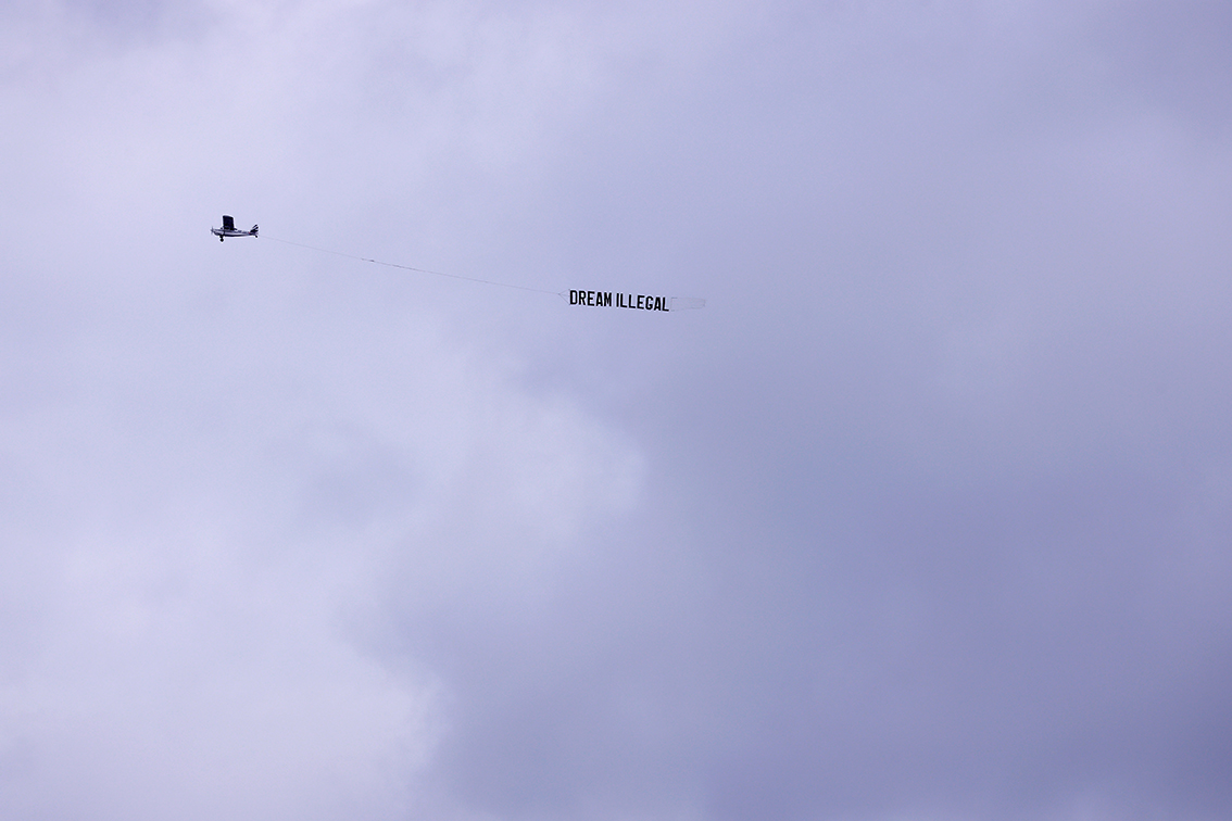 To this end, on 18 October 2025, between 12 noon and 2 p.m., a banner flight with the words 'DREAM ILLEGAL' could be seen above Munich city centre. This is an artistic intervention by the Arcadian Ambassador H.E. Peter Kees, the EMBASSY OF ARCADIA, in cooperation with PLATFORM Munich.