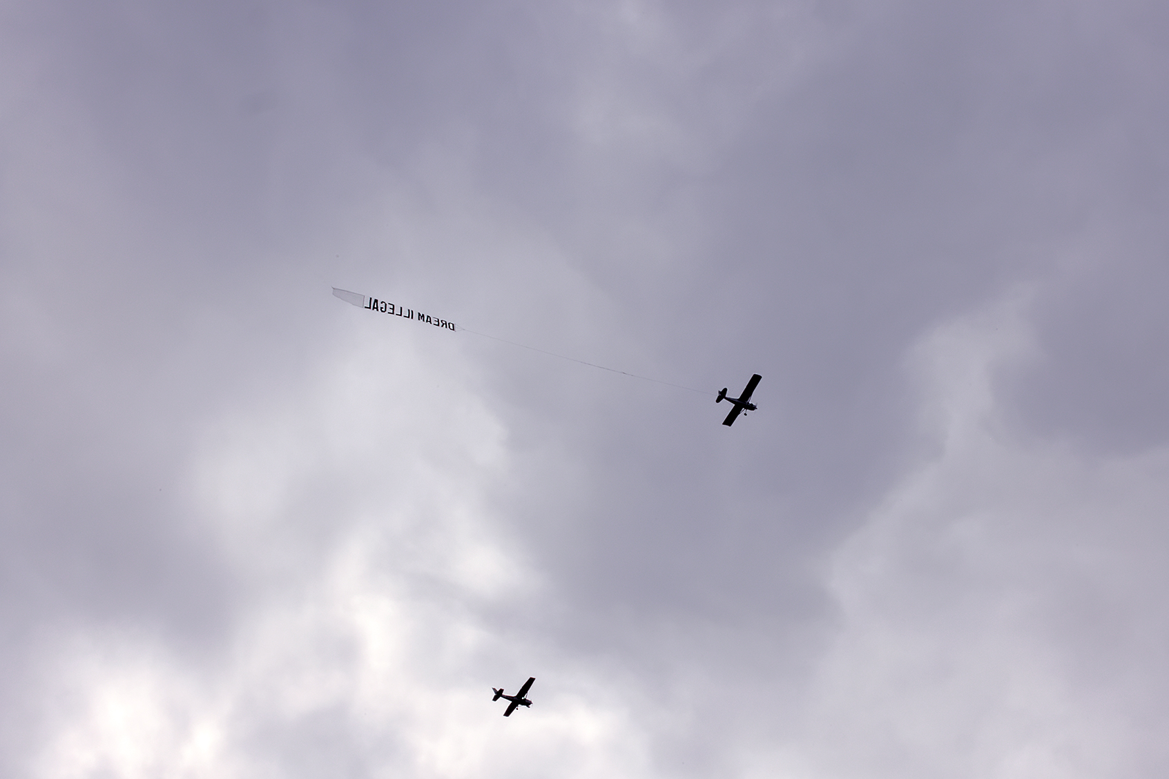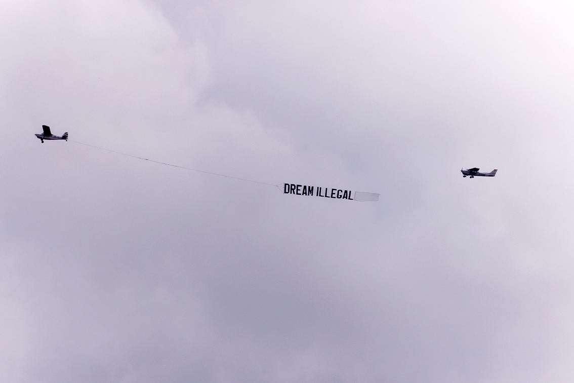 Dazu war am 18. Oktober 2025, in der Zeit von 12-14 Uhr, ein Bannerflug mit dem Schriftzug „DREAM ILLEGAL“ über der Innenstadt von München zu sehen. Dabei handelt es sich um eine künstlerische Intervention des Arkadischen Botschafters S.E. Peter Kees, der EMBASSY OF ARCADIA, in Kooperation mit der PLATFORM München.